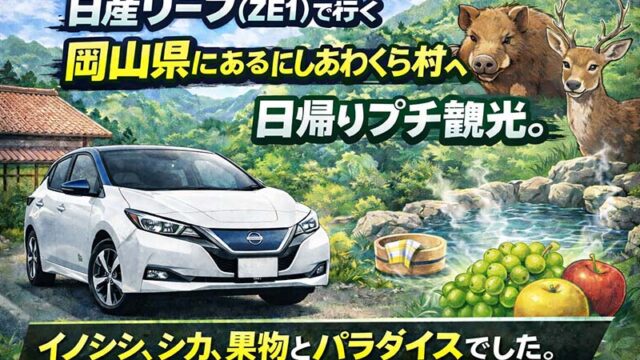 日産リーフ(ZE1型)で行く岡山県にある西粟倉村への日帰りプチ観光。猪、鹿、果物、温泉とパラダイスでした。