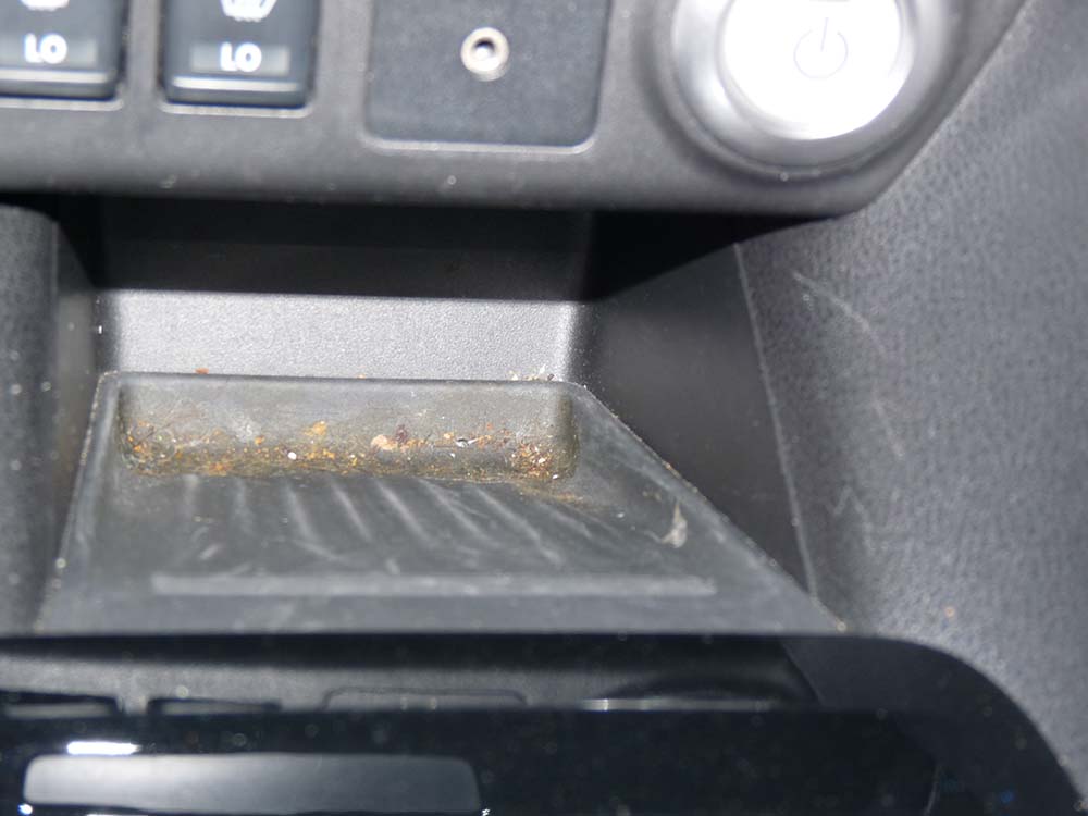 またシフト上の小物入れに関しては全く清掃をされていないような状態でした。死角になりやすい部分ですが全く清掃がされていません。気になるのはこの汚れはタバコの葉の粉のようにも見えます。禁煙車ということでしたがこれがタバコの粉なら虚偽になります。