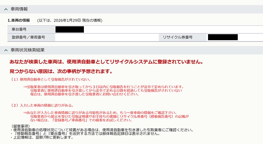 他社と比べて買取価格が著しく低かったなど様々な口コミがあります。今回私は下取り価格がないということだったので完全抹消の廃車をお願いしました。手元には車体番号とリサイクル券のコピーがあるので自動車リサイクルシステムで検索をしたのですが