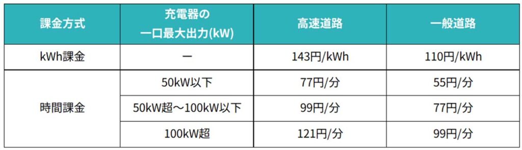 見るべきところはkWh課金のところで高速道なら143円/kWh、一般道で110円/kWhというところです。ZE1(前期型)で条件が悪い時(バッテリー残量が多い、気温が低い、バッテリー温度が高いなど)時に50kWh充電器で20分充電した場合10kWh程度の充電ができました。それぐらいであれば時間課金55円/分と変わらないのですが