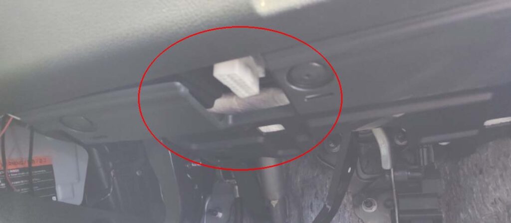 ハンドル下にあるODB端子にODB2スキャナーを接続してください。その後スマートフォンでLeafSpyを立ち上げてBluetoothでペアリングをしてください。